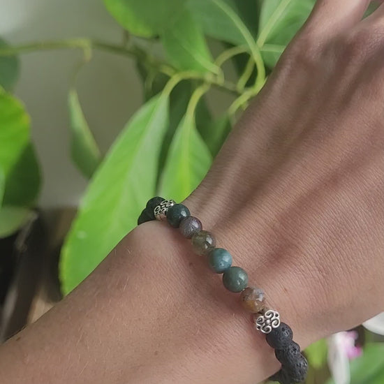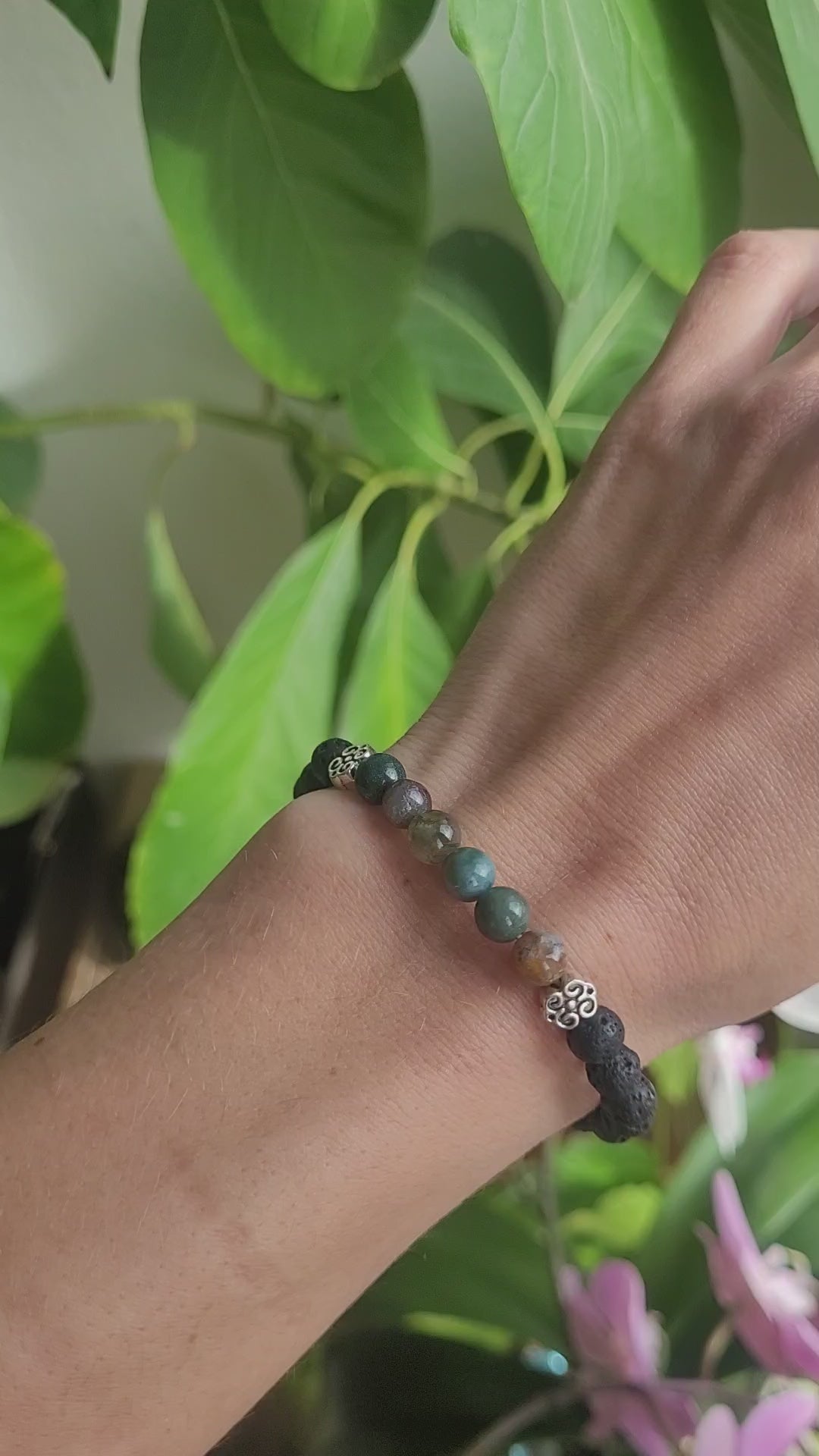 🌿 Bracelet en Agate Mousse et Pierres de Lave, avec intercalaires en métal argenté. 🌋