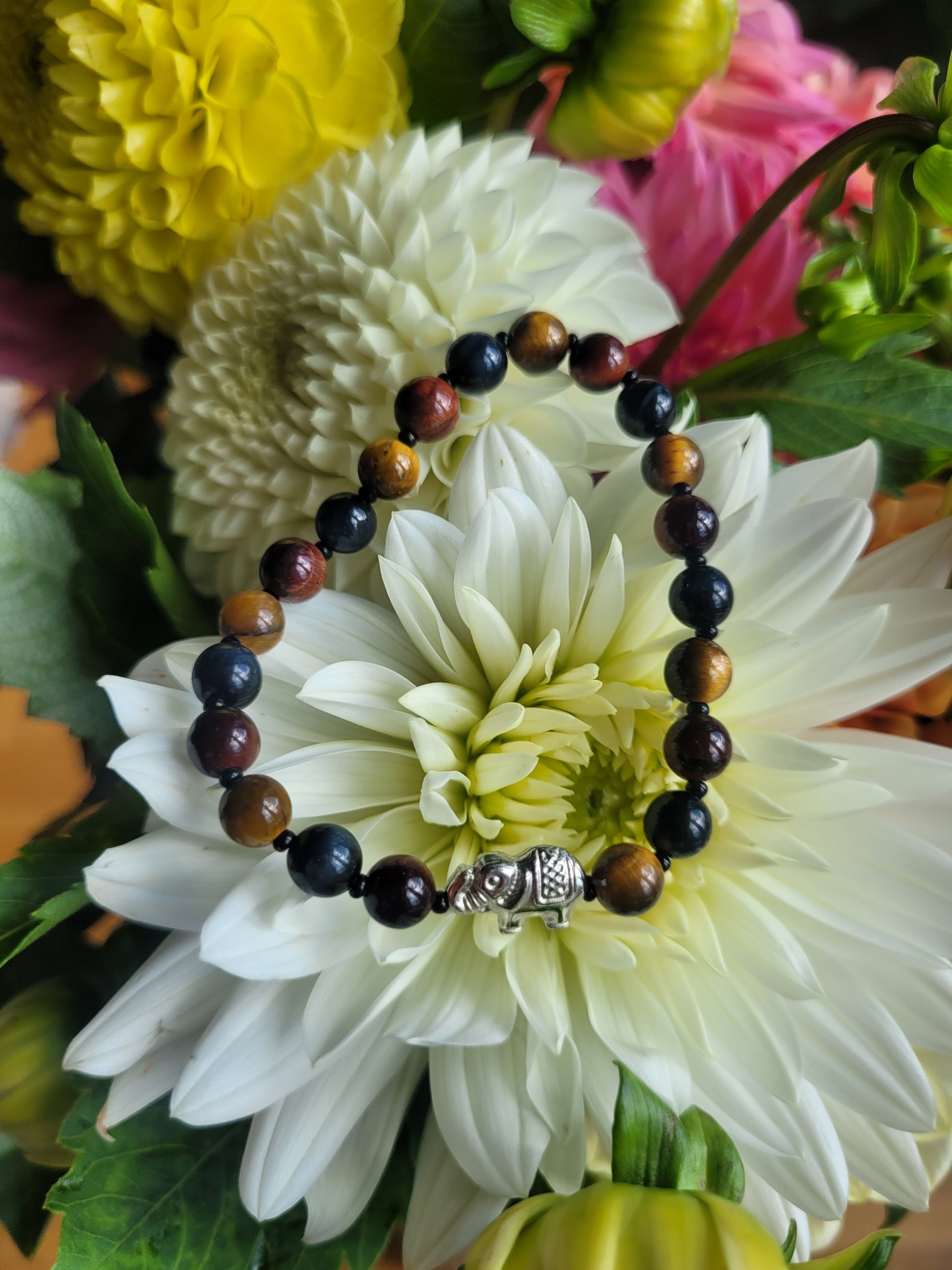 Bracelet de Protection en Oeil de Tigre, Oeil de Boeuf, Oeil de Faucon et éléphant argenté