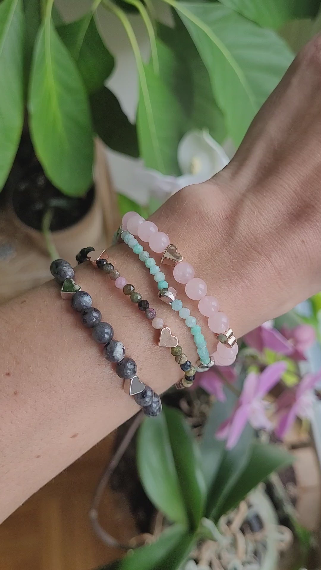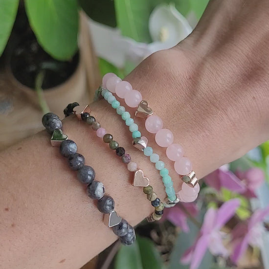 ✨ Bracelet en Labradorite foncée et coeurs en métal argenté💝