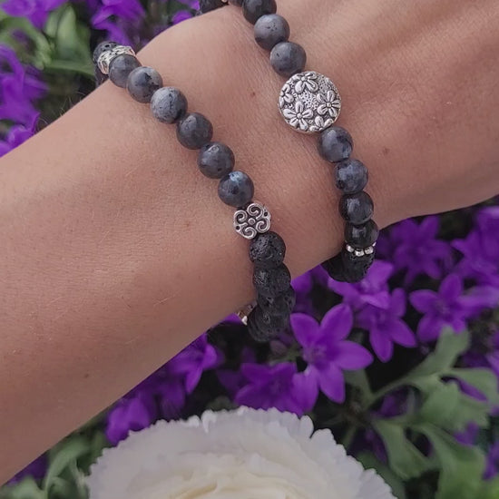 Bracelet en Lave, Labradorite et fleurs argentées