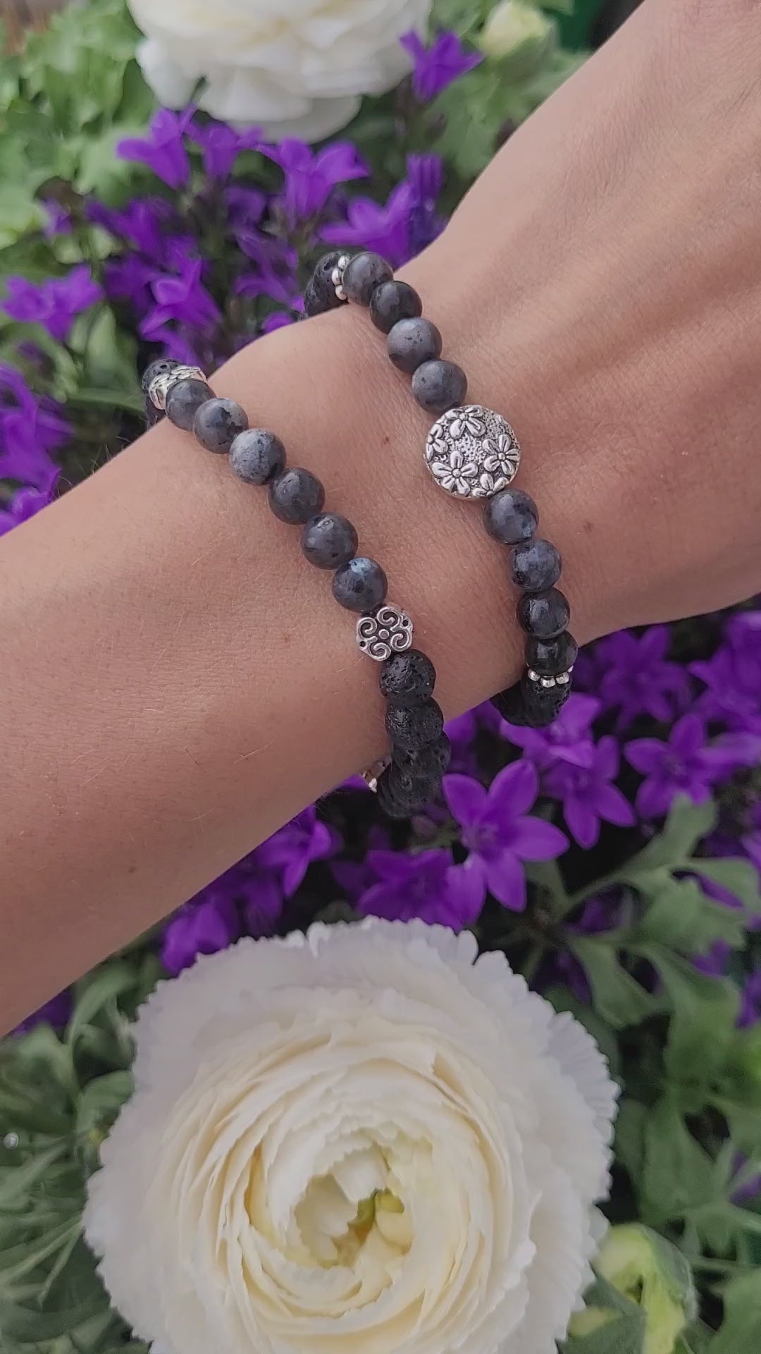 ✨ Bracelet en Lave, Labradorite et fleurs en métal argenté💝