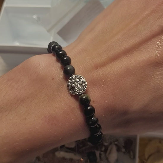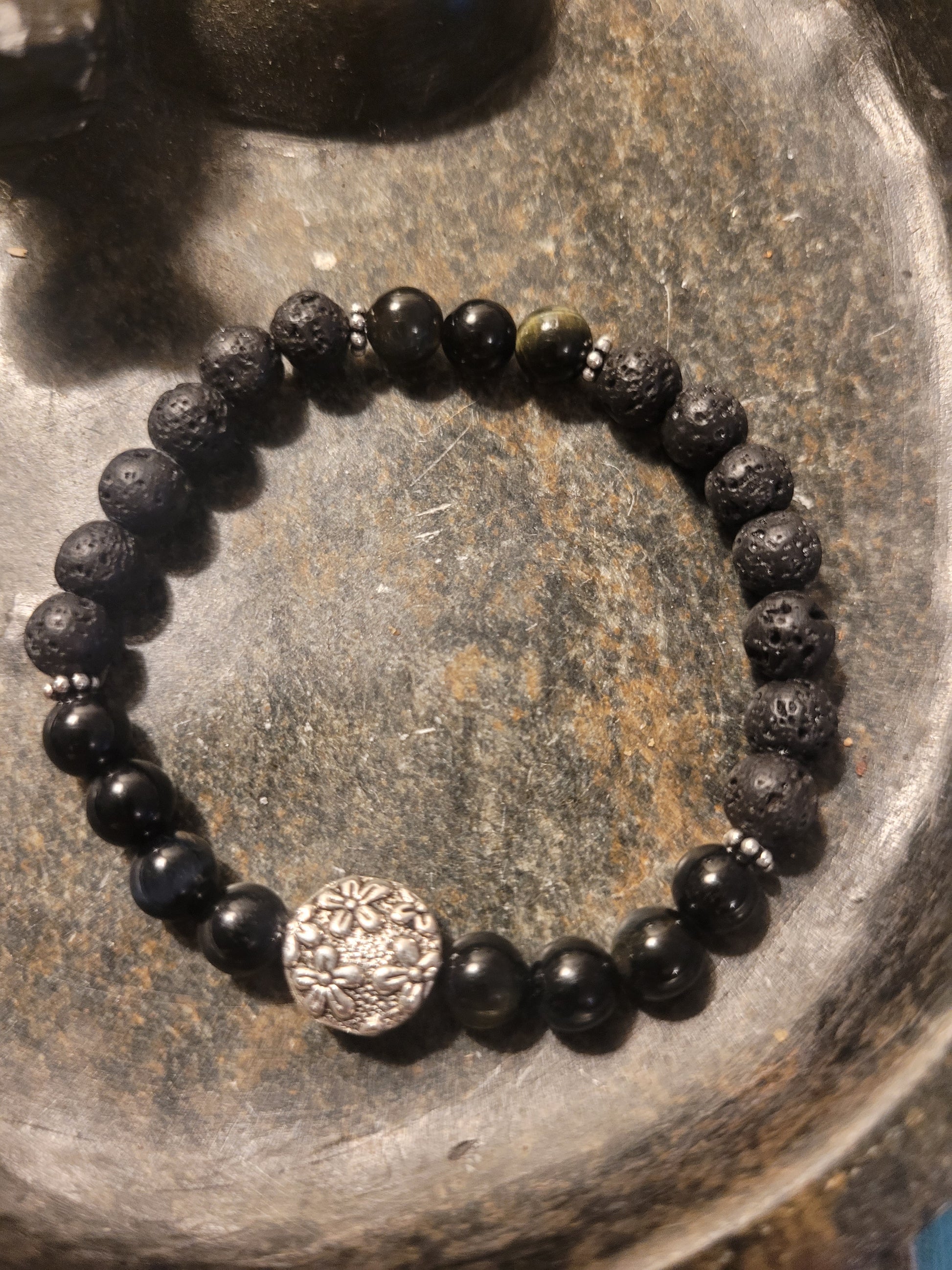 Bracelet en Lave, Oeil de faucon et fleurs argentées