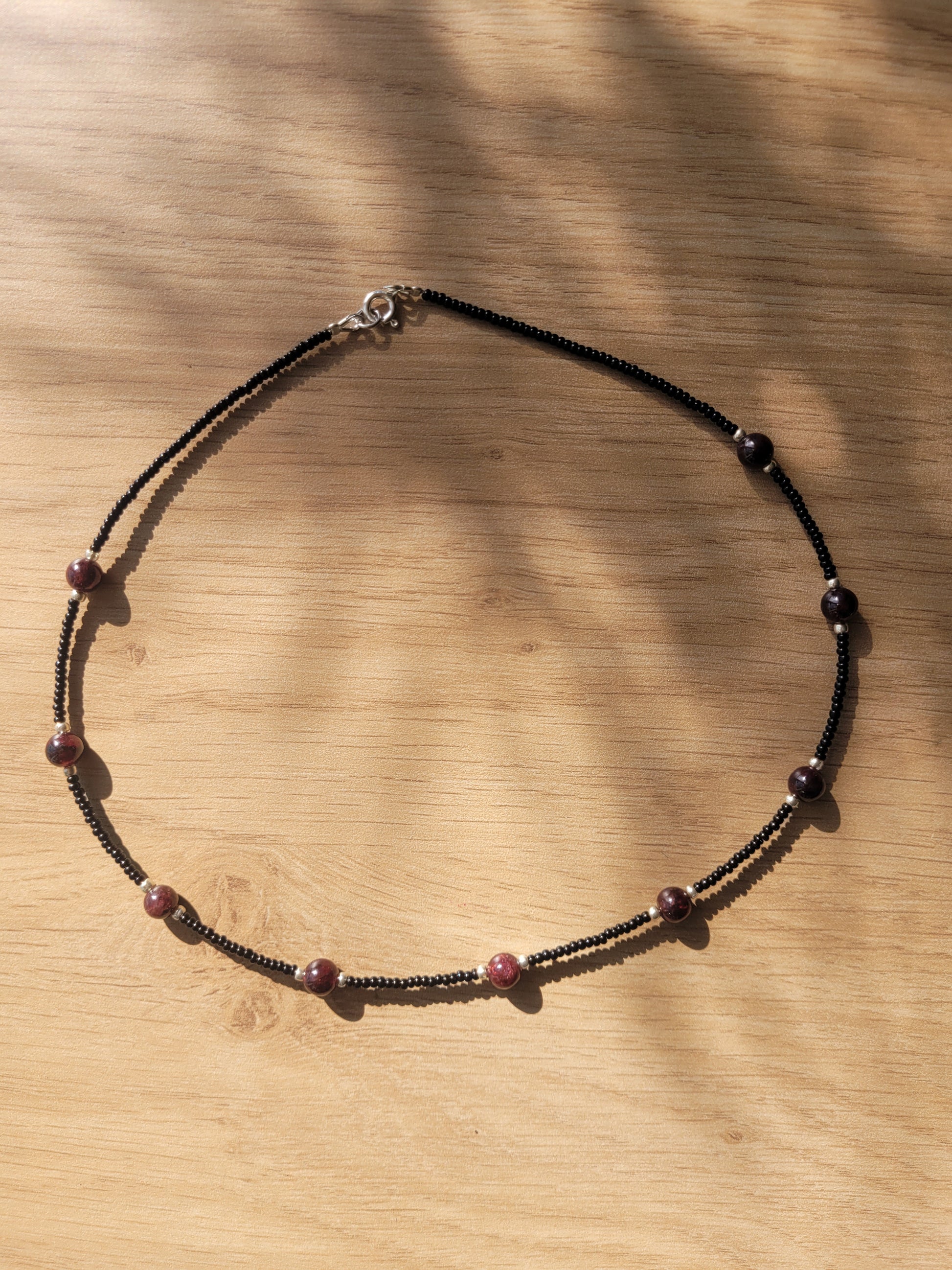 💖Collier en Grenat Almandin, perles de rocailles noires et fermoir en argent