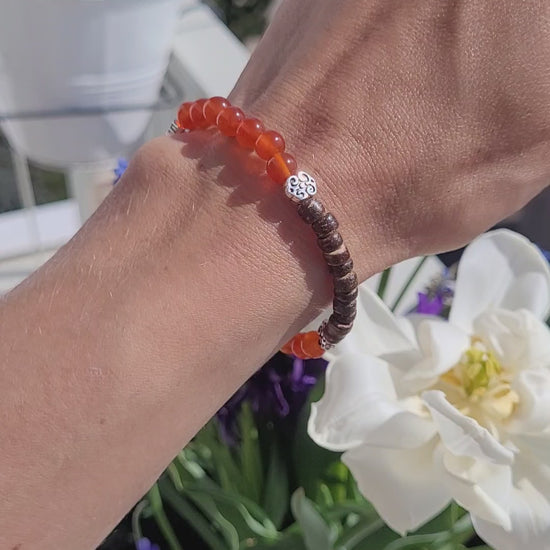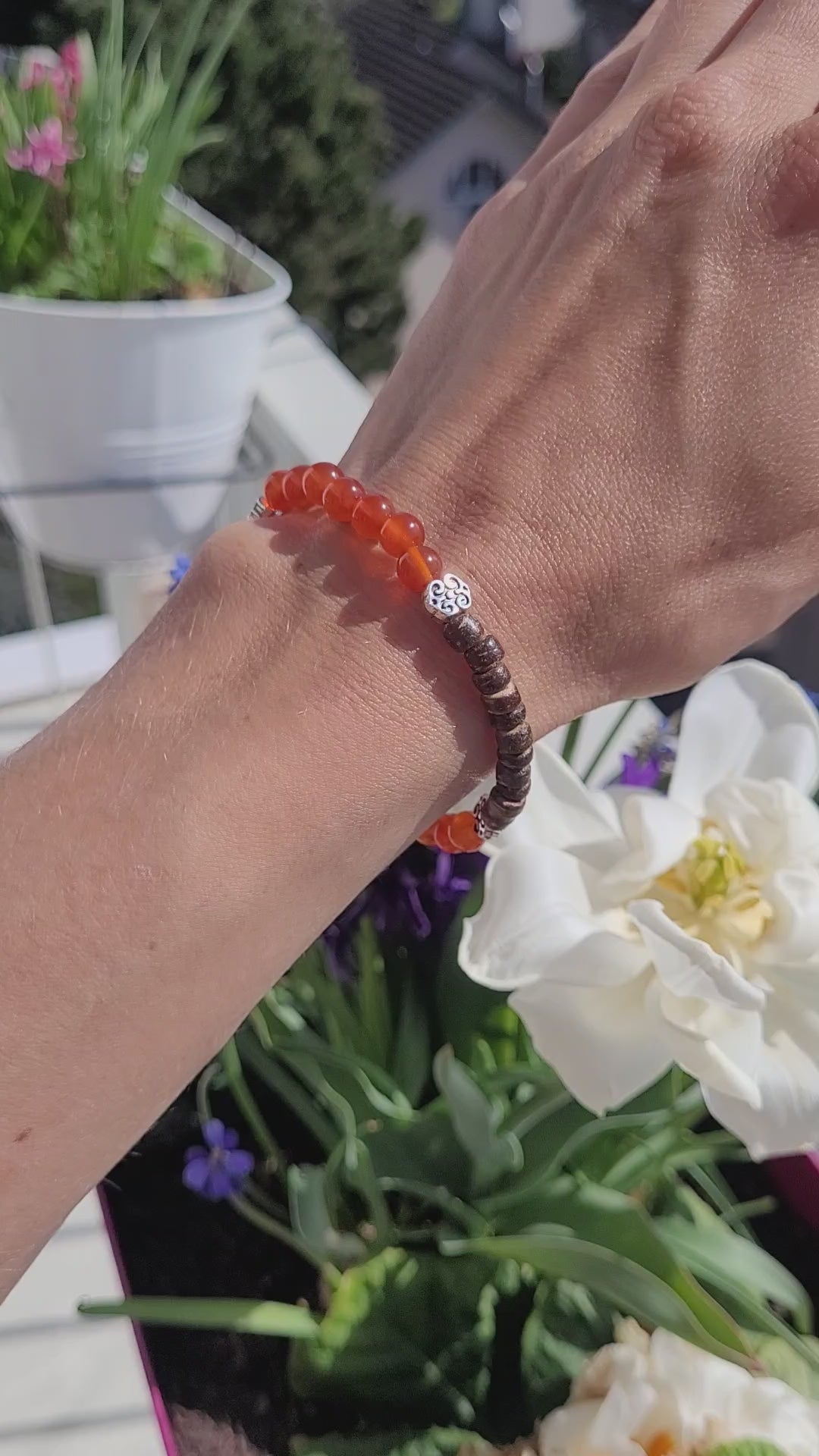 Bracelet en Cornaline, perles de Coco et fleurs argentées